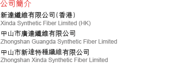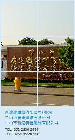 新達纖維有限公司(香港)/中山市廣達纖維有限公司/中山市新達特種纖維有限公司是外商獨資大型化纖紡絲企業,隸屬香港利興強集團。公司位於中山市高新技術產業火炬開發區內,廣珠東幹線公路旁,緊臨與香港通航的中山港碼頭,水陸交通十分方便,公司廠區占地面積105000平方米,建築面積72000平方米,現有員工400多人,其中專業技術和中、高級管理人員50多人,品質檢查人員70多人,年產錦綸6長絲和滌綸長絲10000噸,錦綸-6半消光高速紡絲級幹切片8000噸。公司全套引進國外先進化纖生產設備和國外技術,所生產系列產品品質長期穩定,其中生產"耐絲龍"牌滌綸長絲、錦綸長絲系列被譽為廣東省名優產品,深受廣大用戶的歡迎。